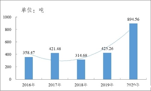 据统计,2016—2020年酉阳县工业危险废物产生量总体呈平稳后上升的趋势(见图2)。2020年酉阳县工业危险废物产生量为894.56吨,产生量陡增的原因是重点产生单位重庆万博再生资源利用有限公司的HW48(有色金属冶炼废物)产生量增加。